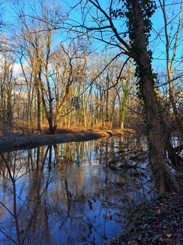 The weather cleared enough after a few weeks of cold that I decided to take a brief stroll before heading to the grocery store. There is a park at the bottom of a hill in town with a pleasant path that follows a creek and a small loop that provides a 15 minute, flat, scenic view. I wasn’t looking for anything strenuous, just some time in nature to calm my mind and get some fresh air in my lungs.